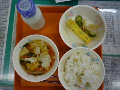 本日の献立は、さつまいもごはん、ぎゅうにゅう、ゆばのすいもの、ごもくあつやきたまご、もやしのナムルです。五目厚焼き卵には、愛知県でとれた卵とにんじん、しいたけ、小松菜、大葉が入っています。