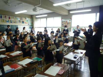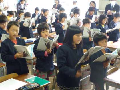 午後から研究授業を行いました。授業は1年生の国語「くじらぐも」です。子どもたちは大きな声で音読していました。