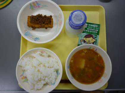今日のメニューは、ご飯、牛乳、秋の味覚汁、厚揚げのそぼろあんかけ、海苔ふりかけでした。厚揚げのそぼろあんかけは応募献立。おいしくいただきました。