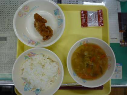 今日のメニューは、ご飯、牛乳、中華スープ、鶏肉のから揚げ、ココアパウダーでした。鶏肉のから揚げは子どもたちの人気メニュー。おいしくいただきました。