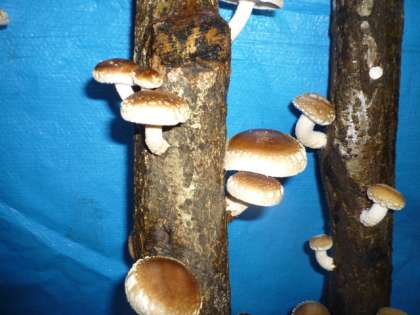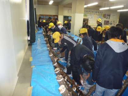 シイタケ栽培5日目。さらにさらに大きくなり、収穫しました。子どもたちは木が乾燥しないように毎日霧吹きで水分を与えています。