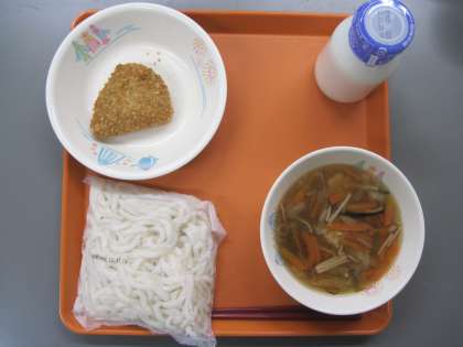 本日の献立は、しらたまうどん、ぎゅうにゅう、ごもくあんかけうどん、かぼちゃコロッケです。
