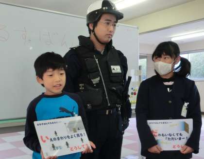 防犯授業「あんしん教室」がありました。防犯会社の隊長さんが来て、安全のために気をつけることを教えてくださいました。るすばんの時に気をつけること、電話がかかってきたら気をつけることなど、実際に練習しながら、覚えていきました。みんなしっかり話が聞けました。