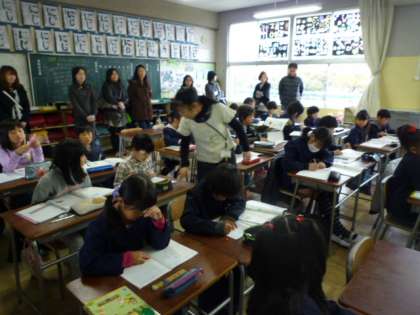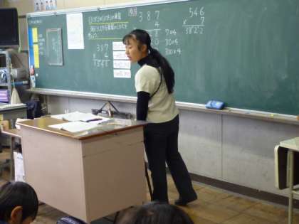 3年生の算数の授業。間違えている子どもがいないか、一人一人のノートを見ています。