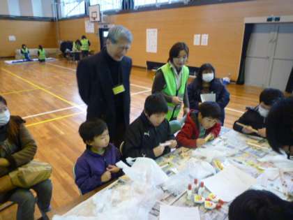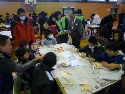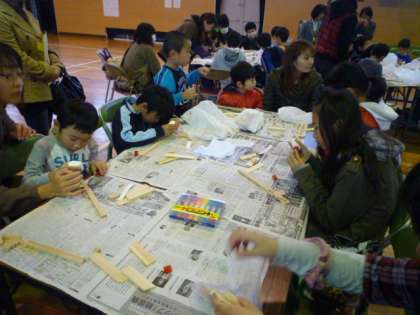 輪ゴム鉄砲づくり。来賓の方に見守られ、子どもたちは一生懸命つくっていました。