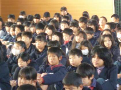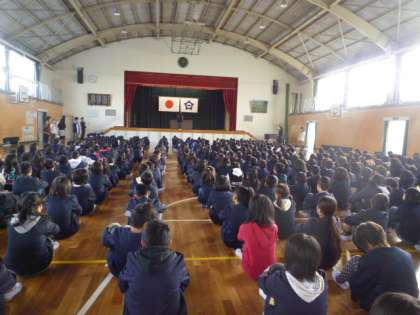 寒い朝。子どもたちはぴしっと整列。原校長の話を真剣に聞いていました。