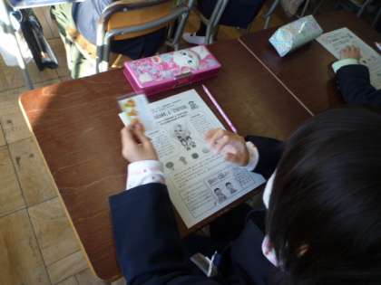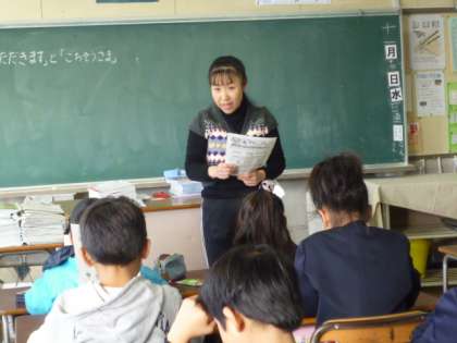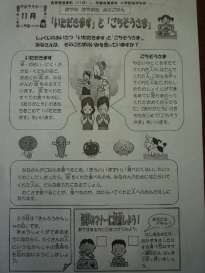 毎月19日は食育の日。今月は全校朝礼、読み聞かせがあったため、今日21日に行いました。今月のテーマは「『いただきます』と『ごちそうさま』」。下の資料を使って行いました。