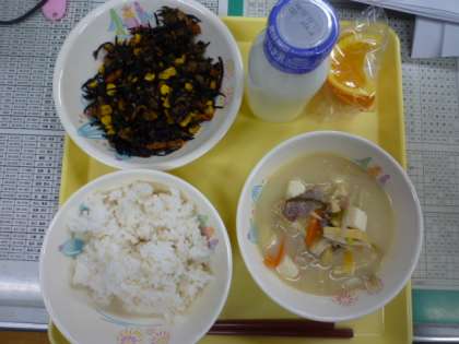 1月23日 本日の給食 公開日 2013/01/23 更新日 2013/01/23 本日の給食 今日のメニューは、ご飯、豚汁、ひじきの炒め煮、いよかんでした。ひじきの炒め煮は子どもたちの人気メニュー。おいしくいただきました。
