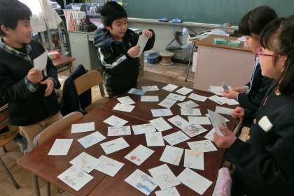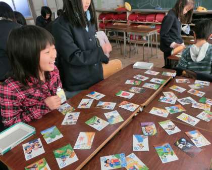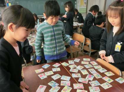 国語の学習で習ったいろいろなかるた取りをしました。グループに分かれて、いろはかるた、都道府県かるた、百人一首、自分たちで作ったかるたなどを楽しく取りました。
