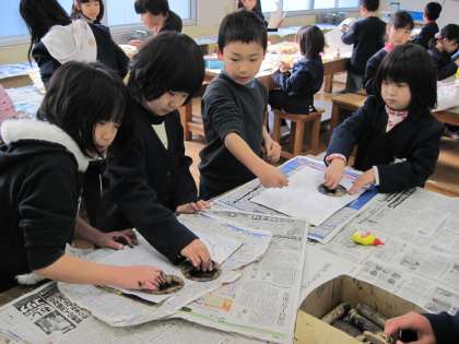 手が真っ黒になりながらも、バレンでこすり、絵が浮き上がってくることに子どもたちは、驚いていました。色々な材料を張り合わせて、版画のおもしろさを感じられるよう取り組んでいきます。