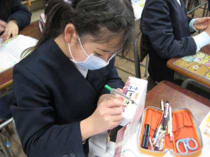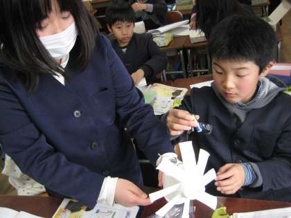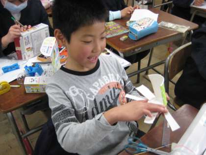 豆電球に電気が付く仕組みを応用して、箱や紙コップでおもちゃ作りを行いました。