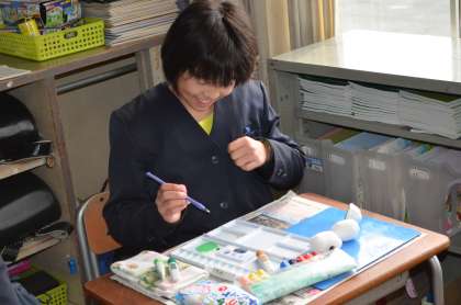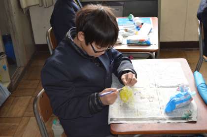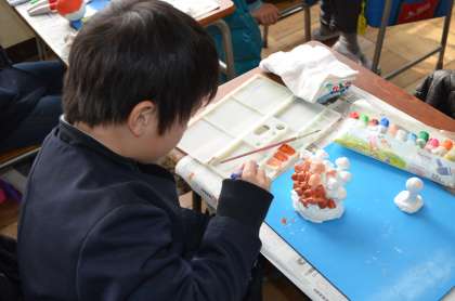 図工の本物そっくりの野菜を紙粘土で作る授業は色塗りに入っています。だんだん本物に近づいてきました。