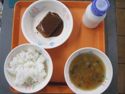 今日の給食の献立は、ご飯、牛乳、すまし汁、焼き豆腐のごまみそ、しそふりかけです。焼き豆腐のごまみそは、田楽の味でした。