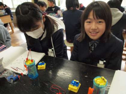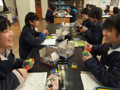 理科で電気について学習しています。今日はコンデンサーに蓄電した後、発光ダイオードがどれだけ点いているかを測る実験をしました。長く点くことに驚いていました。