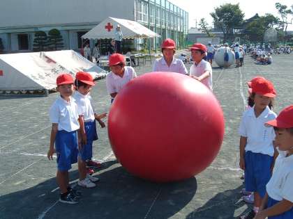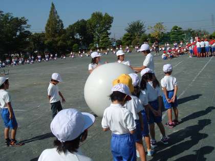 全校練習の後半は、大玉ころがしを行いました。子どもたちが並ぶ位置の確認をしたあと、本番と同じように転がしました。