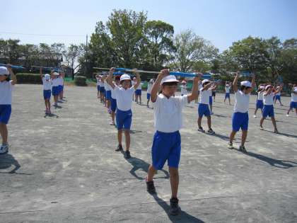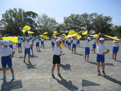 運動会の練習も佳境に入ってきました。暑い中での練習でしたが、日に日に動きもそろってきました。旗を使った美しいハーモニーを本番で見せられるようにがんばっていきます。ご期待ください。
