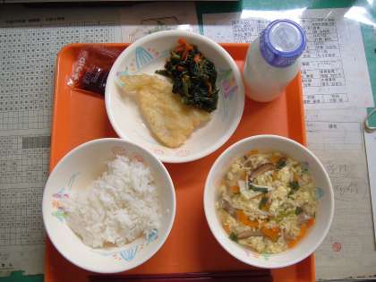 9月24日 本日の給食 公開日 2013/09/24 更新日 2013/09/24 本日の給食 今日のメニューは、ご飯、牛乳、茶碗蒸しスープ、きすの天ぷら、ホウレンソウのおひたしでした。今日は純和風メニュー。おいしくいただきました。