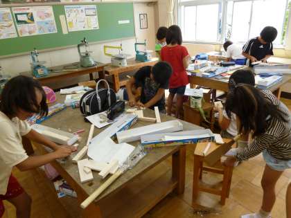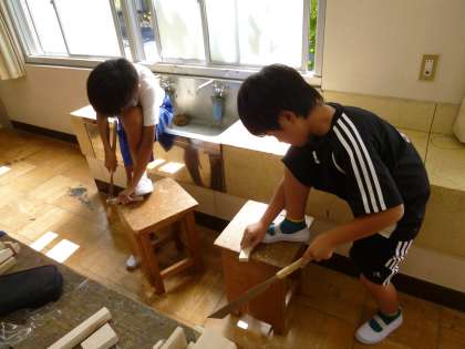 図画工作の学習では、のこぎりを使い始めました。苦戦しながらも、のこぎりを使って小物入れやテレビ、ベットなど作品づくりに励んでいます。