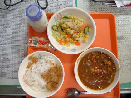 9月27日 本日の給食 公開日 2013/09/27 更新日 2013/09/27 本日の給食 今日のメニューは、ポークカレーライス、牛乳、コーンサラダ、福神漬けでした。カレーライスは子どもたちの人気メニュー。おいしくいただきました。