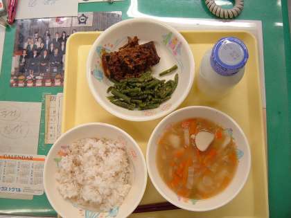 10月1日 本日の給食 公開日 2013/10/01 更新日 2013/10/01 本日の給食 今日のメニューは、麦ごはん、牛乳、すいとん汁、厚揚げの肉みそかけ、インゲンのごまあえでした。厚揚げの肉みそかけは、味噌あじがきいていておいしかったです。