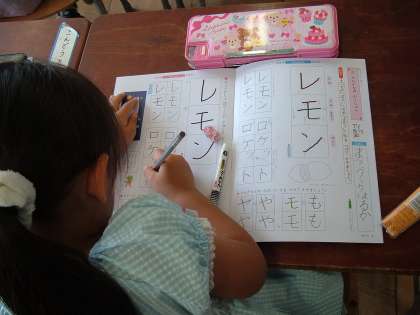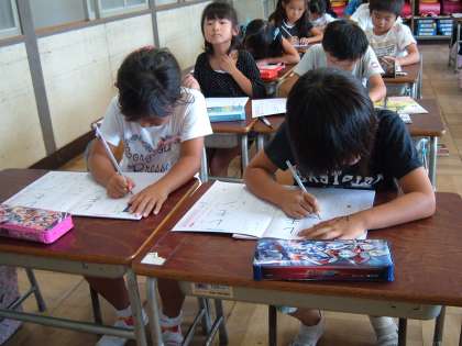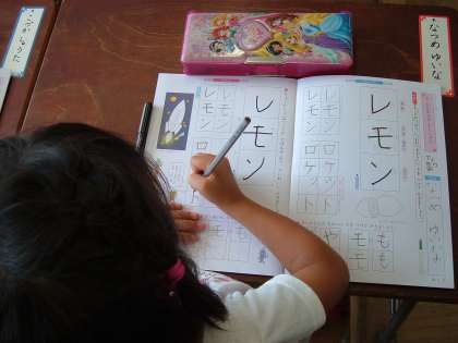 1年生、久しぶりの書写です。今日からカタカナです。はね、とめ、はらい、まがりに気をつけて書きました。
