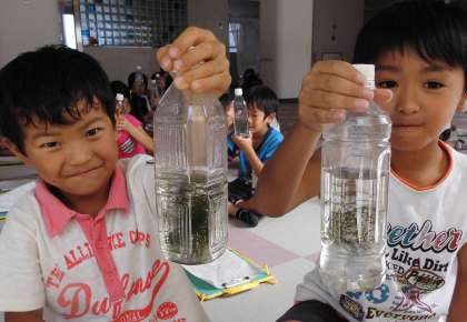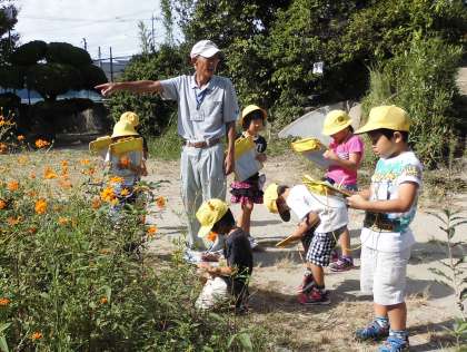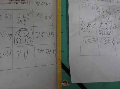 川口先生に来ていただいて、「生活ビンゴ」をしました。外に行って、生き物を探してビンゴの用紙に書きました。ハチ、トンボ、クモ、リンゴの木、コスモス、ヨモギ……。たくさんの生き物を見つけました。ビンゴゲームで、ビンゴになった人から「ヌマエビ」をもらいました。ヌマエビの飼い方のお話を聞いて名前をつけ、おうちで観察することにしました。「かわいいね。ぼくのはヌマタくん。」「わたしはピピちゃん。」「日の当たるところに置いたらだめだよね。」「来年まで長生きするんだって。」大喜びでした。おうちでも声をかけてあげてください。