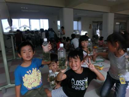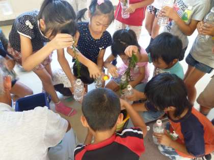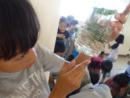 「私のはもう脱皮してる!」「僕のは卵があるよ!」子ども達は大喜び。食い入るようにペットボトルの中を見つめていました。