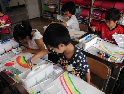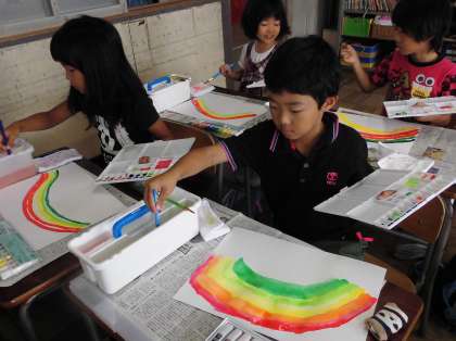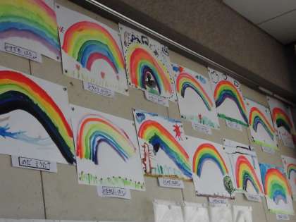 図工の時間に絵の具を使って「にじ」を描きました。絵の具やパレットや筆洗を、机の上にきちんと用意しました。パレットの小さい部屋に絵の具を出して、さあ、虹を描きます。赤、橙、黄、黄緑、緑、青……。みんな真剣です。どんどんきれいになっていきます。最後は、赤と青を混ぜて、すてきな紫を作って、塗りました。教室の後ろにきれいな虹がたくさん出ました。