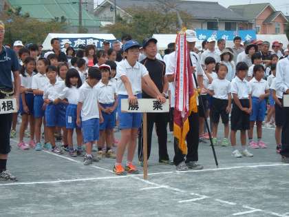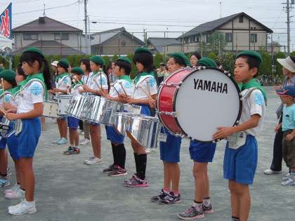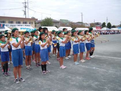今日、千秋町の町民運動会が千秋中学校でありました。本校の金管バンド部の演奏で入場行進を行いました。