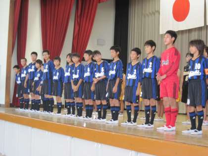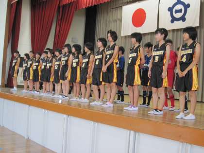 サッカー部とミニバスケットボール部の大会の壮行会を児童集会で行いました。