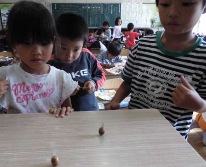 生活科の時間にどんぐりでこまを作りました。コンクリートでごしごしこすって、穴をあけ、つまようじをさしました。うまく回るように、つまようじを短くしたり、向きを少〜し変えたりしました。一番長く回るのはだれのこまかな。今度、遊びましょう。