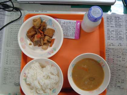 今日のメニューは、ご飯、牛乳、秋の味覚汁、サトイモのうま煮、かつおのふりかけでした。秋の味覚汁は味がしみこんでいておいしかったです。