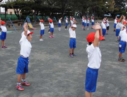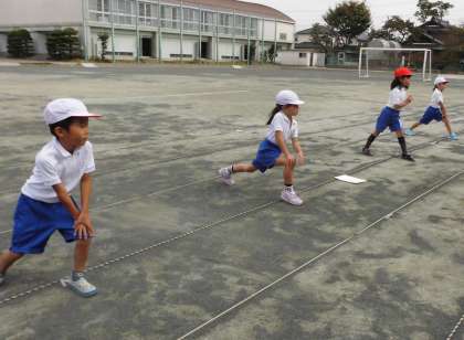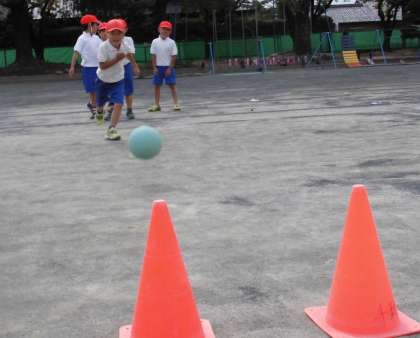 体育の時間に、「ボールあそび」をしました。体育係さんの号令で準備体操をしてから、カラーコーンの間を通したり、カラーコーンの的に当てたりしました。だんだん近くに飛ぶようになりました。「やった!たおれた!」うまく当たると気持ちいいですね。