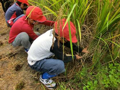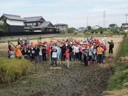 6月に田植えをした千秋っ子ファームの稲がすくすくと大きくなり、稲刈りの季節を迎えました。稲を刈って、それを束ねて、運んで・・・泥だらけになりながら、一生けんめい頑張りました。お米の大切さと、稲刈りの大変さを学ぶことができました。