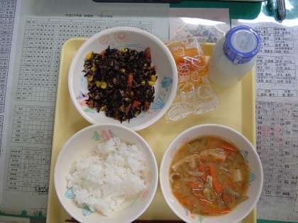 今日のメニューは、ご飯、牛乳、豚汁、ひじきの炒め煮、柿でした。豚汁は味が濃く、おいしかったです。