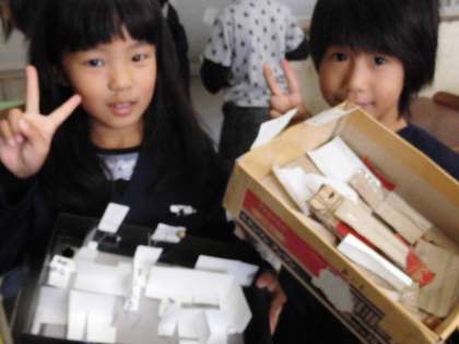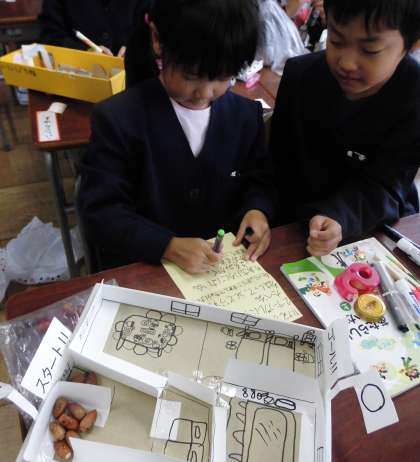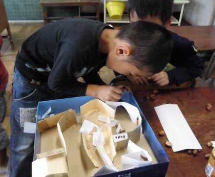 生活科の時間の「あきのおもちゃをつくろう」で、どんぐりごまに続いて、どんぐりめいろを作っています。「ここを通ると、宝物がもらえるんだよ。」「ここは行き止まり!」「トンネルを通らないと次にいけないんだよ。」みんな、どんどんアイデアがわいてきます。