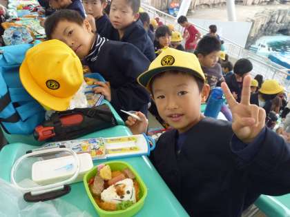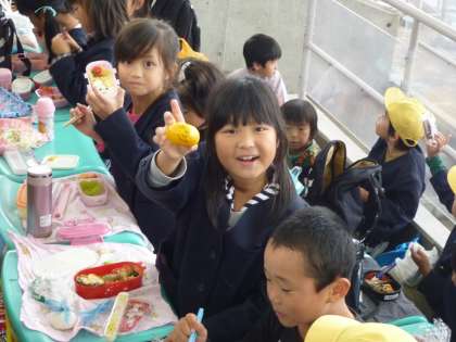子どもたちは、持ってきたお弁当を自慢げに見せながら、嬉しそうに食べていました。