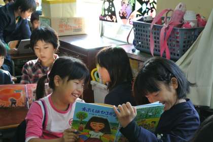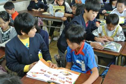 朝読書の時間に、5年生のペアのお兄さん・お姉さんに本を読み聞かせしてもらいました。楽しい時間が過ごせたようです。みんなの笑顔が印象的でした。
