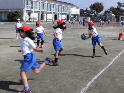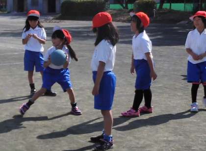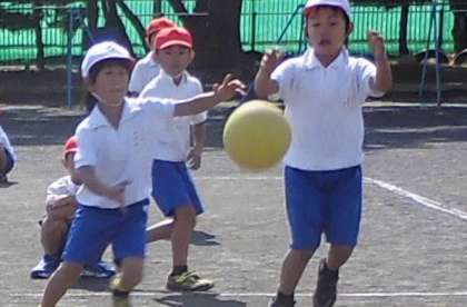 体育の時間に、ドッジボールのゲームをしました。みんなルールがわかってきて、どんどんボールが投げられるようになってきました。ひょっとしたら、国語で習ったくじらぐもが空から見て、応援しているかもしれません。