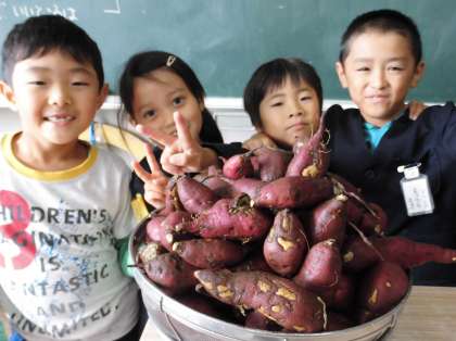 畑で掘ったおいもをきれいに洗いました。「水は冷たいけど、きれいになった。」「赤くなったね。」