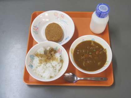 今日のメニューは、ごはん・牛乳・コンこんカレーライス・さつまいもコロッケ・ふくじんづけでした。コンこんカレーライスは、とてもおいしくて好評でした。