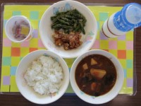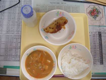 今日のメニューは、ご飯、牛乳、ピリ辛味噌汁、白身魚の黒酢あんかけでした。味噌汁はピリッとしておいしかったです。