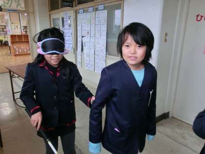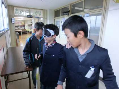 アイマスクと白杖を使って、視覚障害者の体験と、ガイドヘルプ体験を行いました。