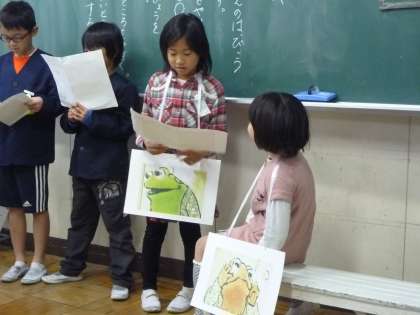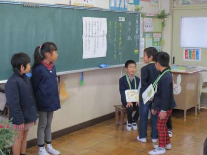 国語の授業では、「お手紙」の音読劇の発表会を行いました。体全体を使い表現しているグループや、小道具を使い発表しているグループもあり、どれもすばらしい発表でした。