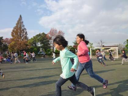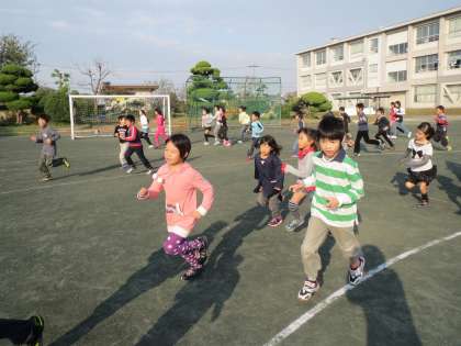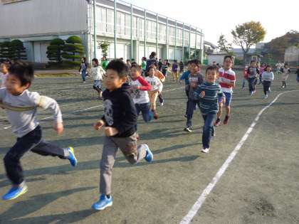いよいよ持久走の練習が始まりました。子どもたちは、準備運動の時からやる気満々で、始まりの音楽がかかると同時に勢いよく走りだしました。