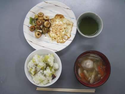 佃煮、玉子焼き、竹輪とねぎの炒め物、