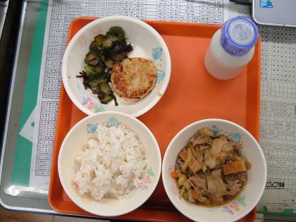今日の給食は,「麦ご飯・牛乳・豚丼・野菜の寄せ焼き・きゅうりの昆布あえ」です。豚丼には,豚肉と色とりどりの野菜が入っていました。たくさん食べる子もいて,栄養いっぱいの給食を味わっていました。
