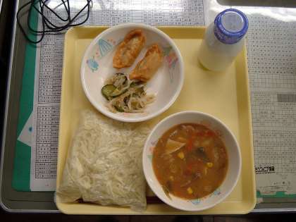 11月20日 本日の給食 公開日 2013/11/20 更新日 2013/11/20 本日の給食 今日のメニューは、味噌ラーメン、牛乳、揚げギョウザ2つ、もやしのナムルでした。ラーメンは子どもたちの人気メニュー。おいしくいただきました。