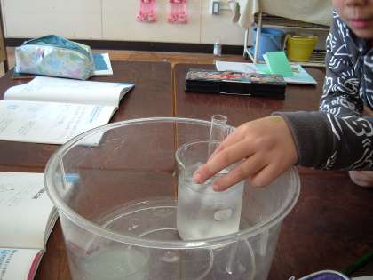 今日は、空気を冷やしたとき体積はどうなるかの実験。子どもたちは、試験管の石鹸の膜に注目。自分たちの予想が正しいかどうか、真剣に見ています。
