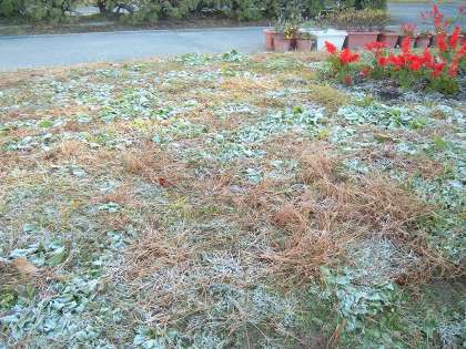 今日の朝は本当に寒かったです。FBC花壇に霜がおりていました。(写真の白い部分は霜です)